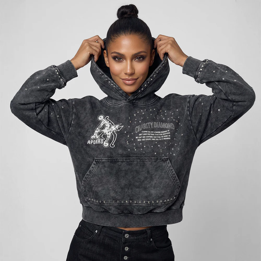 APORRO's Thorned Cross Hoodie reimagines religious symbolism through streetwear aesthetics. The cross silhouette is encircled by thorns, symbolizing the will to advance and a defensive stance against life's pressures. Diamond-studded detailing creates a restrained yet sharp contrast against the low-saturation, distressed gray wash fabricâlike light piercing through scars. The cropped silhouette accentuates body proportions, while the distressed wash texture embodies the energy of maintaining conviction and resilience amidst adversity.
