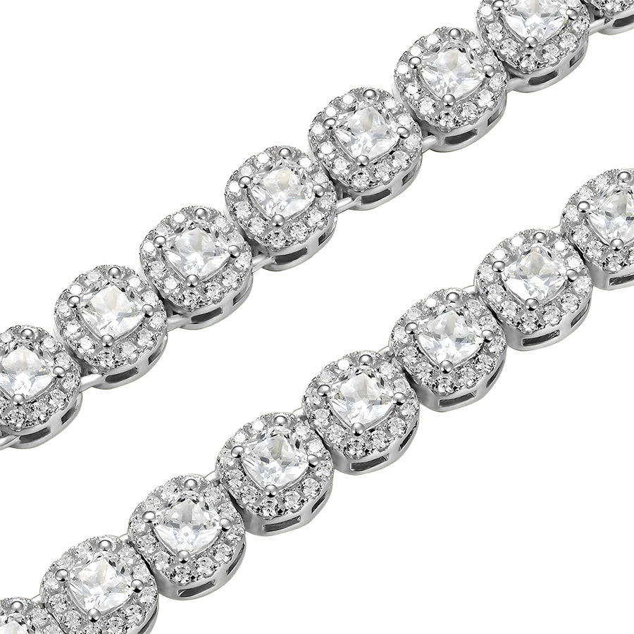 The 7mm Cushion-Cut Clustered Tennis Chain puts a spin on classic tennis chains by featuring a halo of round-cut stones encircling a cushion-cut center stone to maximize the brilliance of the entire chain. It is a versatile addition to your jewelry collection that defines the perfect fusion of timeless style and street culture.
