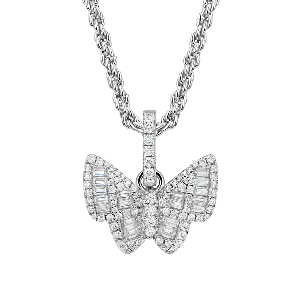 The Moissanite Butterfly Pendant is inspired by butterflies - one of the trendiest icon in the fashion world. Hand set with 2.305ct of VVS moissanite, the combination of baguette- and round-cut moissanite makes it a fashion must-have to level up your fits.