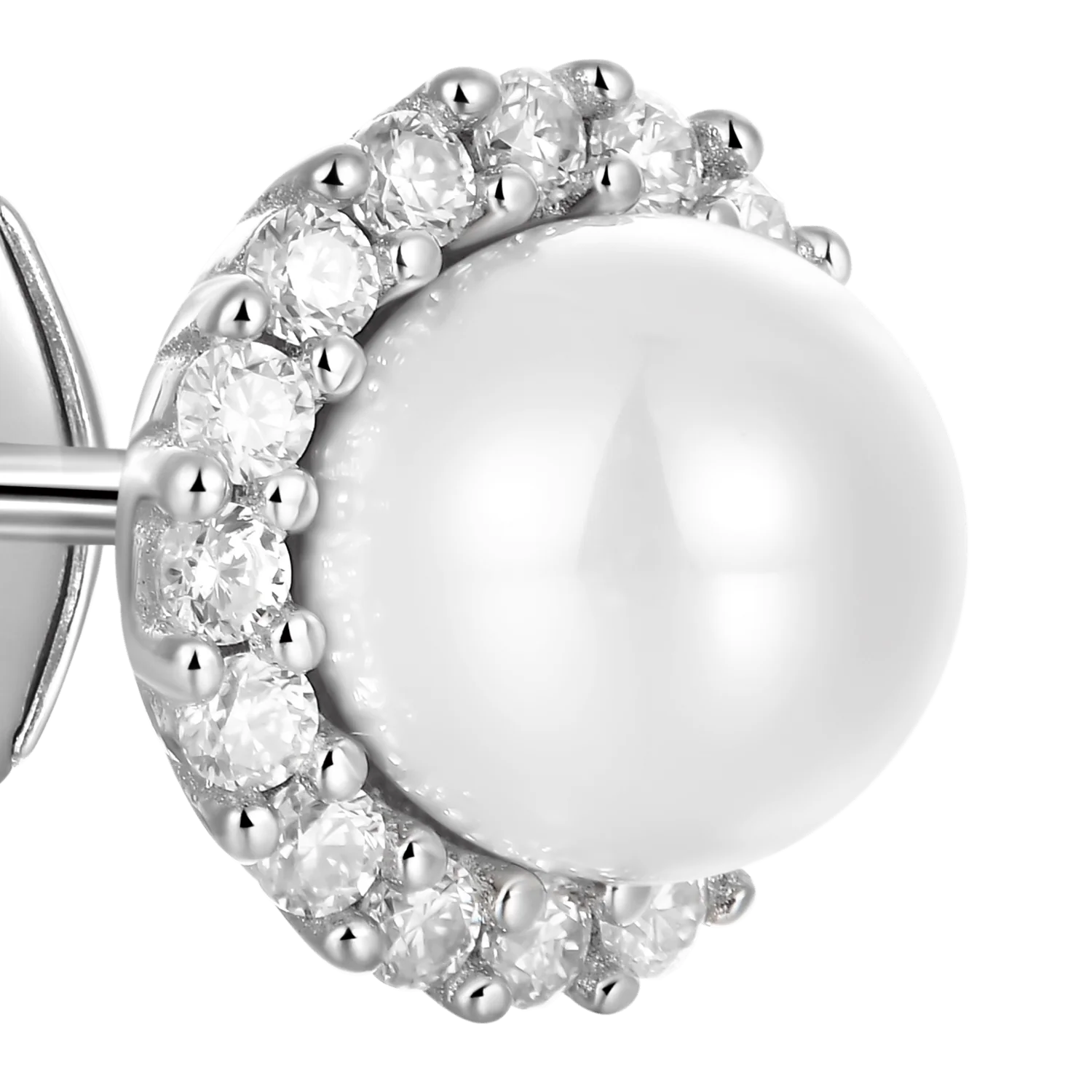 The earrings continue the simple design concept and are suitable for any occasion. The pearl is 6mm in diameter and is encircled by 12 white moissanite, making them simple and delicate.