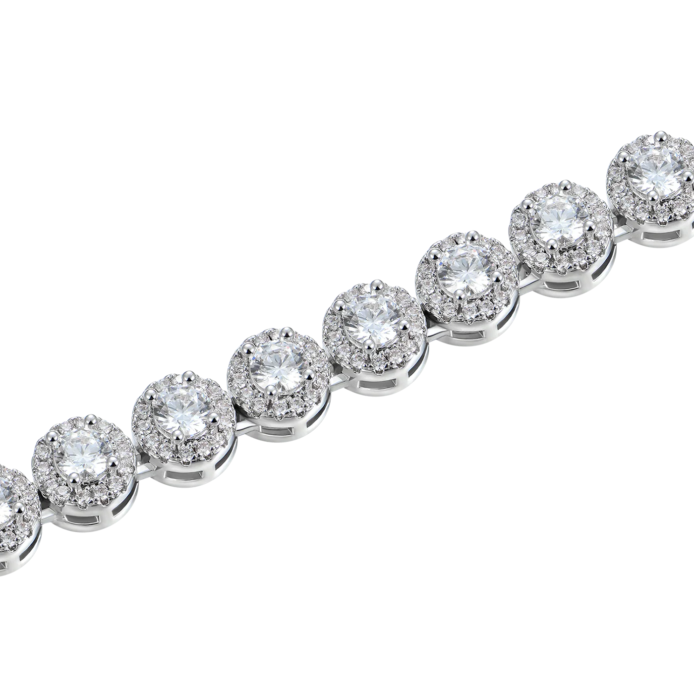 The 7mm Round Cut Clustered Tennis Bracelet puts a spin on classic tennis bracelets by featuring a halo of round-cut stones encircling a center stone to maximize the brilliance of the entire bracelet. It is a versatile addition to your jewelry collection that defines the perfect fusion of timeless style and street culture.