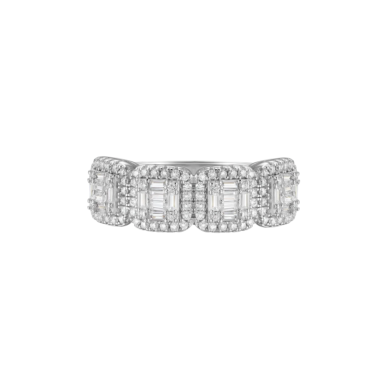 The Moissanite Tri-Halo Ring features a mixture of baguette and round-cut moissanite clustered into three halo cushions. The halo cluster design of the smaller stones encircling the centered stones maximizes the brilliance of the moissanite, making them a head-turning masterpiece.